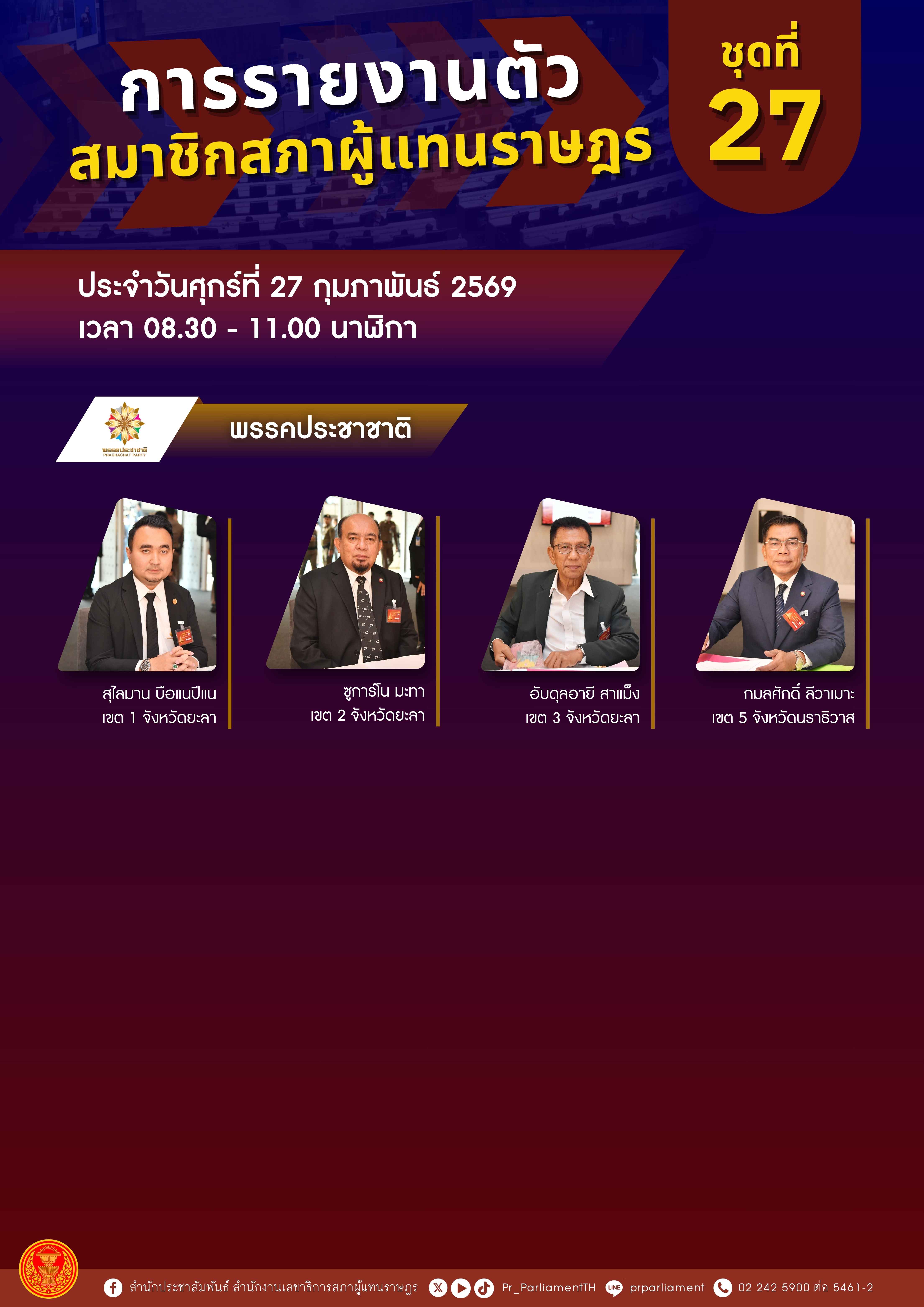 สมาชิกสภาผู้แทนราษฎร (สส.) พรรคประชาชาติ เดินทางเข้ารายงานตัวต่อสำนักเลขาธิการสภาผู้แทนราษฎร ภายหลังจากที่ คณะกรรมการการเลือกตั้ง (กกต.) ได้ประกาศรับรองผลการเลือกตั้ง สส.แบบแบ่งเขตเลือกตั้งอย่างเป็นทางการ ประกอบด้วย นายสุไลมาน บือแนปีแน เขต 1 จังหวัดยะลา นายซูการ์โน มะทา เขต 2 จังหวัดยะลา นายอับดุลอายี สาแม็ง เขต 3 จังหวัดยะลา และนายกมลศักดิ์ ลีวาเมาะ เขต 5 จังหวัดนราธิวาส