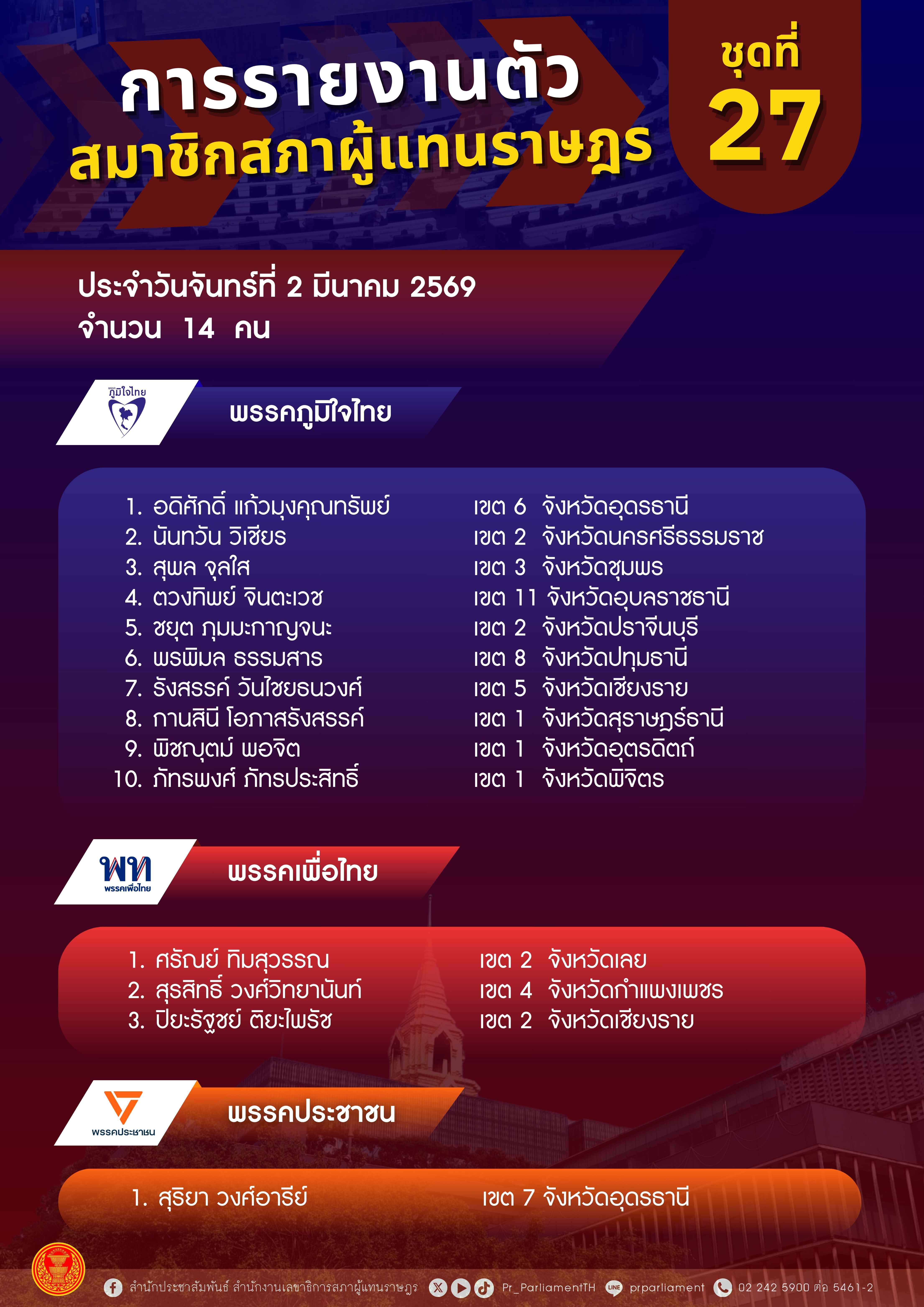 วันที่ 5 ของการเปิดรับรายงานตัวสมาชิกสภาผู้แทนราษฎร (สส.) ชุดที่ 27 ต่อสำนักงานเลขาธิการสภาผู้แทนราษฎร (สนง.สผ.) ในวันนี้ (2 มี.ค.69) ระหว่างเวลา 08.30 – 16.30 น. ณ ชั้น B1 อาคารรัฐสภา ภายหลังคณะกรรมการการเลือกตั้ง (กกต.) ประกาศรับรองผลการเลือกตั้ง มี สส.แบบแบ่งเขตเลือกตั้งมารายงานตัว 14 คน แบ่งเป็น พรรคภูมิใจไทย (ภท.) จำนวน 10 คน พรรคเพื่อไทย (พท.) จำนวน 3 คน และพรรคประชาชน (ปชน.) จำนวน 1 คน