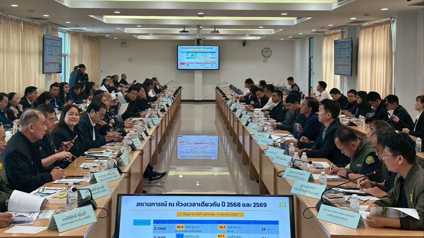 นายชีวะภาพ ชีวะธรรม ประธานคณะกรรมาธิการ (กมธ.) ทรัพยากรธรรมชาติและสิ่งแวดล้อม วุฒิสภา นำคณะลงพื้นที่จังหวัดน่าน เพื่อติดตามสถานการณ์สิ่งแวดล้อม การบริหารจัดการทรัพยากรธรรมชาติ และการเฝ้าระวังปัญหามลพิษ หมอกควัน และไฟป่า พร้อมรับฟังข้อห่วงกังวลของประชาชนกรณีการขนย้ายเถ้าลอยจากโรงไฟฟ้าถ่านหินในสาธารณรัฐประชาธิปไตยประชาชนลาว (สปป.ลาว) หลังเกิดอุบัติเหตุรถบรรทุกพลิกคว่ำจนเถ้าถ่านหินรั่วไหลในพื้นที่ โดยมีนายบรรจง ขุนเพชร รองผู้ว่าราชการจังหวัดน่าน และหน่วยงานที่เกี่ยวข้องร่วมบรรยายสรุปสถานการณ์ โดยสำนักงานทรัพยากรธรรมชาติและสิ่งแวดล้อมจังหวัดน่าน รายงานว่า ระหว่างวันที่ 1 ม.ค. – 5 มี.ค. 69 ค่าเฉลี่ยฝุ่น PM2.5 อยู่ที่ 26.03 ไมโครกรัมต่อลูกบาศก์เมตร มีเพียง 24 วันที่ค่าฝุ่นเกินมาตรฐาน ลดลงจากช่วงเดียวกันของปี 68 ที่มี 58 วัน หรือลดลงร้อยละ 58.62 ขณะที่จุดความร้อนในปี 69 พบ 509 จุด ลดลงจากปี 68 ที่พบ 764 จุด หรือร้อยละ 33.38 โดยจังหวัดตั้งเป้าลดจุดความร้อนไม่ให้เกิน 3,238 จุด พร้อมดำเนินมาตรการแก้ไขไฟป่าและหมอกควันแบบบูรณาการ 12 มาตรการหลัก และ 5 มาตรการเพิ่มเติม เน้นทำงานเชิงรุกลงพื้นที่สร้างความเข้าใจกับประชาชนเพื่อลดการเผา