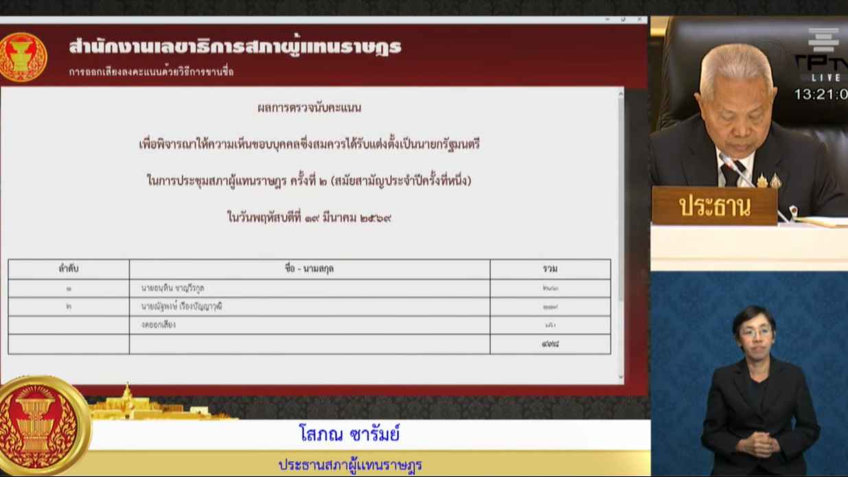 ทั้งนี้ ภายหลังการลงคะแนน ที่ประชุมมีมติเห็นชอบ นายอนุทิน ชาญวีรกูล ด้วยคะแนน 293 เสียง ขณะที่นายณัฐพงษ์ เรืองปัญญาวุฒิ ได้รับคะแนนเห็นชอบ 119 เสียง งดออกเสียง 86 เสียง เป็นอันว่า นายอนุทิน ชาญวีรกูล ได้รับคะแนนเห็นชอบมากกว่ากึ่งหนึ่งของสมาชิกทั้งหมดเท่าที่มีอยู่ของสภาผู้แทนราษฎร ดังนั้น จึงถือว่าที่ประชุมมีมติเห็นชอบให้แต่งตั้งนายอนุทิน ชาญวีรกูล เป็นนายกรัฐมนตรี ตามรัฐธรรมนูญมาตรา 159