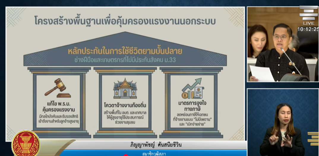 ศาสตราจารย์ ชาญณรงค์ พรรุ่งโรจน์ รองประธาน กมธ. พร้อมคณะ กล่าวถึงผลการพิจารณาว่า ปัจจุบันไทยมีผู้สูงอายุกว่า 13.6 ล้านคน คิดเป็นร้อยละ 20.94 ของประชากรทั้งหมด ก้าวเข้าสู่ "สังคมสูงอายุโดยสมบูรณ์" แล้ว และคาดว่าในปี 2576 จะพุ่งแตะร้อยละ 28 จนเข้าสู่ "สังคมสูงอายุระดับสุดยอด" ขณะที่อัตราการเกิดต่ำกว่า 500,000 คนต่อปี และมีผู้เสียชีวิตมากกว่าการเกิด ส่งผลให้กำลังแรงงานหดตัวและกระทบเศรษฐกิจในระยะยาว การศึกษาครั้งนี้จึงมุ่งวิเคราะห์สถานการณ์และหาแนวทางเสริมสร้างพลังผู้สูงอายุให้พึ่งพาตนเองได้ มีบทบาทในการพัฒนาประเทศ และดำรงชีวิตได้อย่างมีศักดิ์ศรี โดยยึดแนวคิดขององค์การอนามัยโลกใน 3 ด้าน คือ สุขภาพ การมีส่วนร่วม และความมั่นคง ทั้งนี้ จากการศึกษาดัชนีพลังผู้สูงอายุ ปี 2567 ของสำนักงานสถิติแห่งชาติ พบว่าไทยมีคะแนนรวม 64.6 โดยด้านที่น่าเป็นห่วงที่สุดคือการมีส่วนร่วมในสังคม ซึ่งมีคะแนนต่ำสุดเพียง 41.3 ขณะที่ผู้สูงอายุกว่าร้อยละ 80 ที่ยังทำงานอยู่เป็นแรงงานนอกระบบ ขาดหลักประกันและสวัสดิการพื้นฐาน สะท้อนถึงช่องว่างเชิงนโยบายที่ต้องเร่งแก้ไข