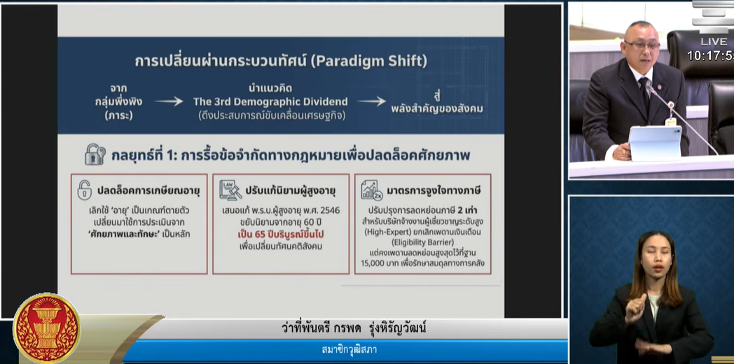 ขณะที่ ว่าที่พันตรี กรพด รุ่งหิรัญวัฒน์ สว. เสนอ 3 กลยุทธ์เร่งด่วนในการรับมือวิกฤตโครงสร้างประชากร ได้แก่ 1.การปรับปรุงกฎหมายเกษียณอายุโดยยึดศักยภาพแทนอายุ และมอบสิทธิลดหย่อนภาษี 2 เท่าแก่นายจ้างที่จ้างงานผู้สูงอายุ 2. พัฒนาแพลตฟอร์มบูรณาการข้อมูลเพื่อจัดหางาน ปรับสภาพแวดล้อมตามหลักอารยสถาปัตย์ พร้อมจัดตั้งสถานีชีวาภิบาลในชุมชน และ 3. ยกระดับทักษะดิจิทัลสำหรับแรงงานอายุ 50 ปีขึ้นไป พร้อมรณรงค์ปรับทัศนคติสังคมให้มองผู้สูงอายุเป็นพลังขับเคลื่อนสังคมแทนการเป็นภาระ
