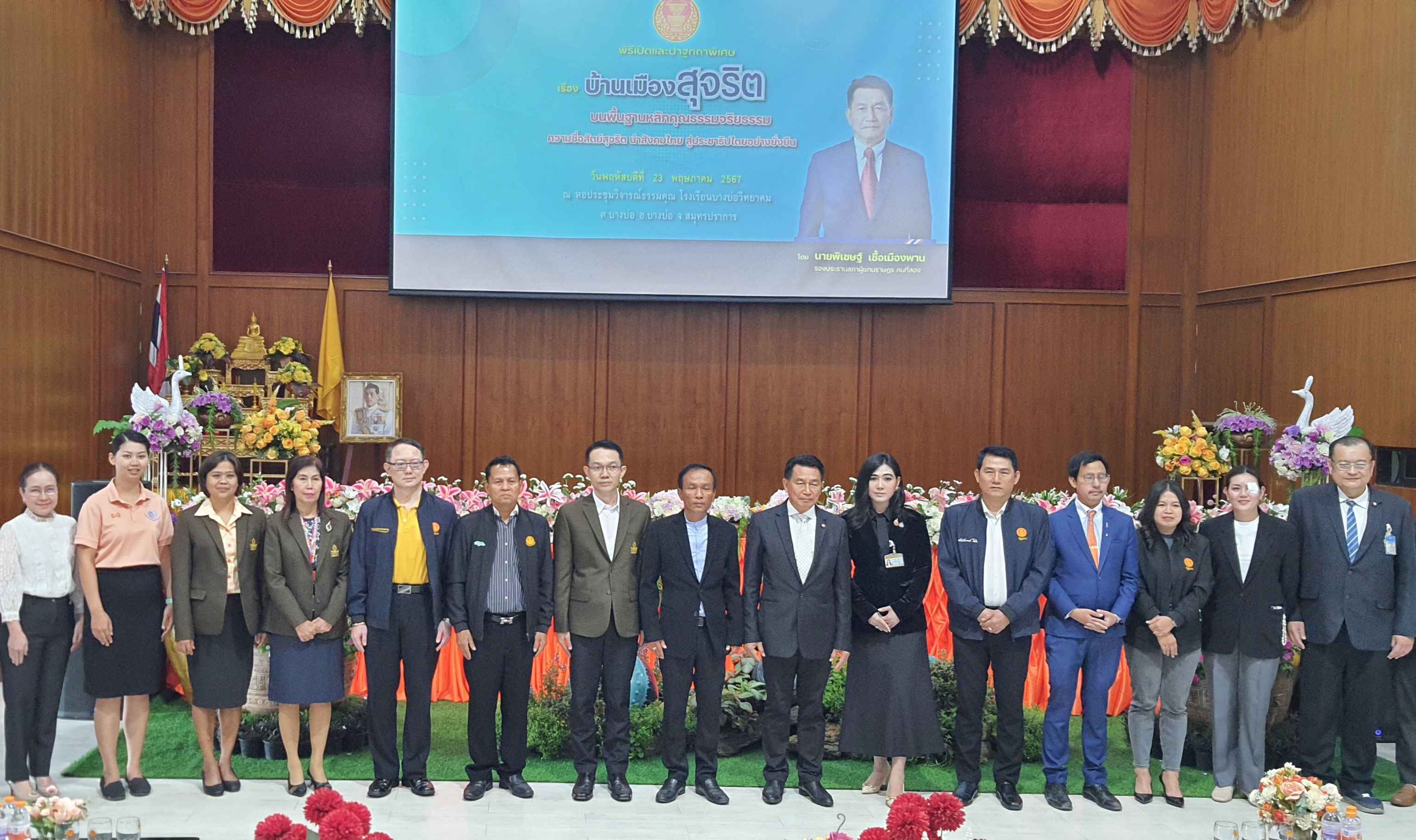 นายพิเชษฐ์ เชื้อเมืองพาน รองประธานสภาผู้แทนราษฎร คนที่สอง เป็นประธานในพิธีเปิดโครงการเสริมสร้างบ้านเมืองสุจริตภายใต้ระบอบประชาธิปไตยอันมีพระมหากษัตริย์ทรงเป็นประมุข ประจำปีงบประมาณ พ.ศ.2567 กิจกรรมเสริมสร้างบ้านเมืองสุจริต : หัวใจของการพัฒนาประชาธิปไตย ณ หอประชุมวิจารณ์ธรรมคุณ โรงเรียนบางบ่อวิทยาคม ตำบลบางบ่อ อำเภอบางบ่อ จังหวัดสมุทรปราการ จัดโดย คณะกรรมการบริหารโครงการเสริมสร้างบ้านเมืองสุจริต ร่วมกับ สำนักงานประธานสภาผู้แทนราษฎร สำนักวิชาการ สำนักประชาสัมพันธ์ และสถานีวิทยุกระจายเสียงและวิทยุโทรทัศน์รัฐสภา โดยมี สมาชิกสภาผู้แทนราษฎร (สส.) จังหวัดสมุทรปราการ พรรคก้าวไกล เข้าร่วม ได้แก่ นายตรัยวรรธน์ อิ่มใจ นายวีรภัทร คันธะ นางสาวนิตยา มีศรี และนางสาวรัชนก สุขประเสริฐ และมี นายกรกฏ บุญญามิ่ง นายอำเภอบางบ่อ จังหวัดสมุทรปราการ กล่าวต้อนรับ พร้อมนำกลุ่มเป้าหมายเข้าร่วม ประกอบด้วย นักเรียน นิสิต นักศึกษา และครูอาจารย์ จากโรงเรียนและมหาวิทยาลัยในจังหวัดสมุทรปราการ รวมจำนวน 350 คน แบ่งเป็น มหาวิทยาลัยราชภัฏธนบุรี โรงเรียนบางบ่อวิทยาคม โรงเรียนอิสลามสมุทรปราการ (มะซออนุสรณ์) โรงเรียนบดินทรเดชา (สิงห์ สิงหเสนี) สมุทรปราการ และโรงเรียนเซนต์ราฟาแอล