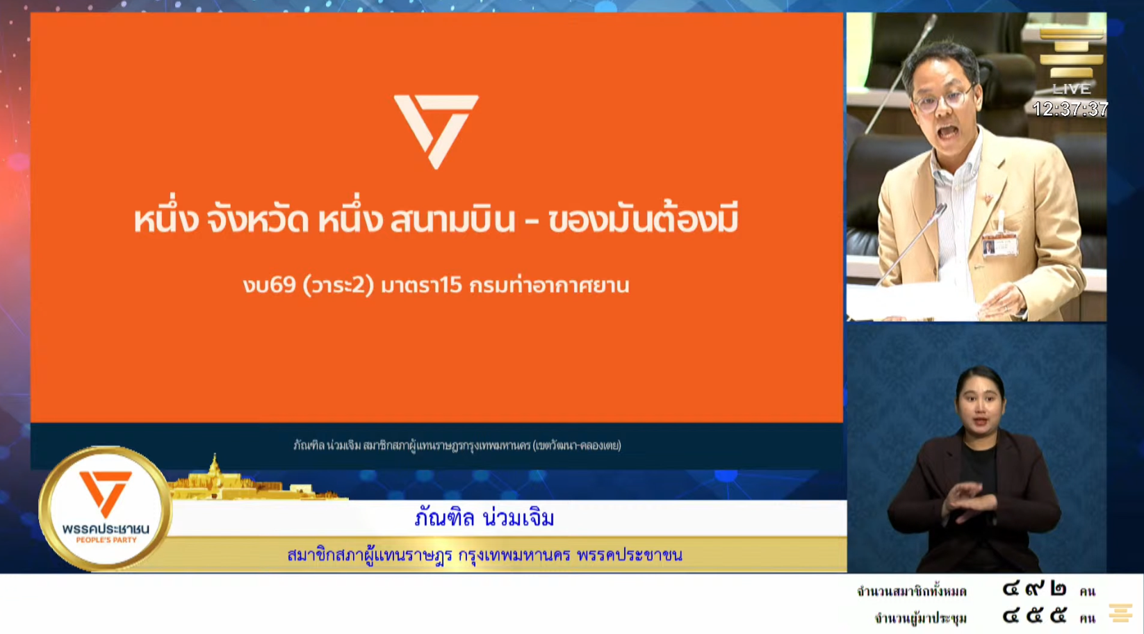 นายภัณฑิล น่วมเจิม สมาชิกสภาผู้แทนราษฎร (สส.) พรรคประชาชน กรุงเทพมหานคร ในฐานะที่ตนเป็น กรรมาธิการ (กมธ.) วิสามัญ เสียงข้างน้อย กล่าวอภิปรายร่างพระราชบัญญัติ (พ.ร.บ.) งบประมาณรายจ่ายประจำปีงบประมาณ พ.ศ.2569 มาตรา 15 งบประมาณของกระทรวงคมนาคม โดยขอปรับลดงบประมาณของกรมท่าอากาศยาน ว่า เนื่องจากข้อกังวลเกี่ยวกับการลงทุนสร้างสนามบินใหม่และภาระค่าใช้จ่ายระยะยาวที่ตามมา แม้ว่ารัฐบาลพยายามเดินหน้านโยบายแนวคิด “1 จังหวัด 1 สนามบิน” ซึ่งทุกครั้งที่มีการสร้างสนามบินแต่ละครั้งมักมีการวิ่งเต้นของบประมาณ แต่เมื่อสร้างแล้วจะมีค่าใช้จ่ายตามมามหาศาล โดยงบประมาณที่มีอยู่ในปัจจุบันยังไม่เพียงพอรักษาสนามบินเดิมให้มีมาตรฐาน และการเปิดสนามบินใหม่จะยิ่งทำให้เกิดค่าใช้จ่ายอื่น ๆ ตามมา โดยเฉพาะอย่างยิ่งค่าใช้จ่ายด้านความปลอดภัยตามข้อบังคับของ องค์การการบินพลเรือนระหว่างประเทศ (ICAO) ซึ่งค่าใช้จ่ายการลงทุนระยะยาวสูง การลงทุนสร้างสนามบินภูมิภาคอยู่ที่ 2,000-3,000 ล้านบาท และมีค่าใช้จ่ายระยะยาวในการดูแลถึง 30-50 ล้านบาทต่อปี นอกจากนี้ยังมีต้นทุนค่าโดยสารที่แท้จริงอยู่ที่ประมาณ 800-1,500 บาท แต่การขายตั๋วราคาถูกเพื่อดึงดูดลูกค้าทำให้มีรายได้ไม่ยั่งยืน และสุดท้ายรัฐต้องนำงบประมาณเข้าไปอุดหนุนเป็นภาระค่าใช้จ่ายต่อเนื่องในระยะยาว