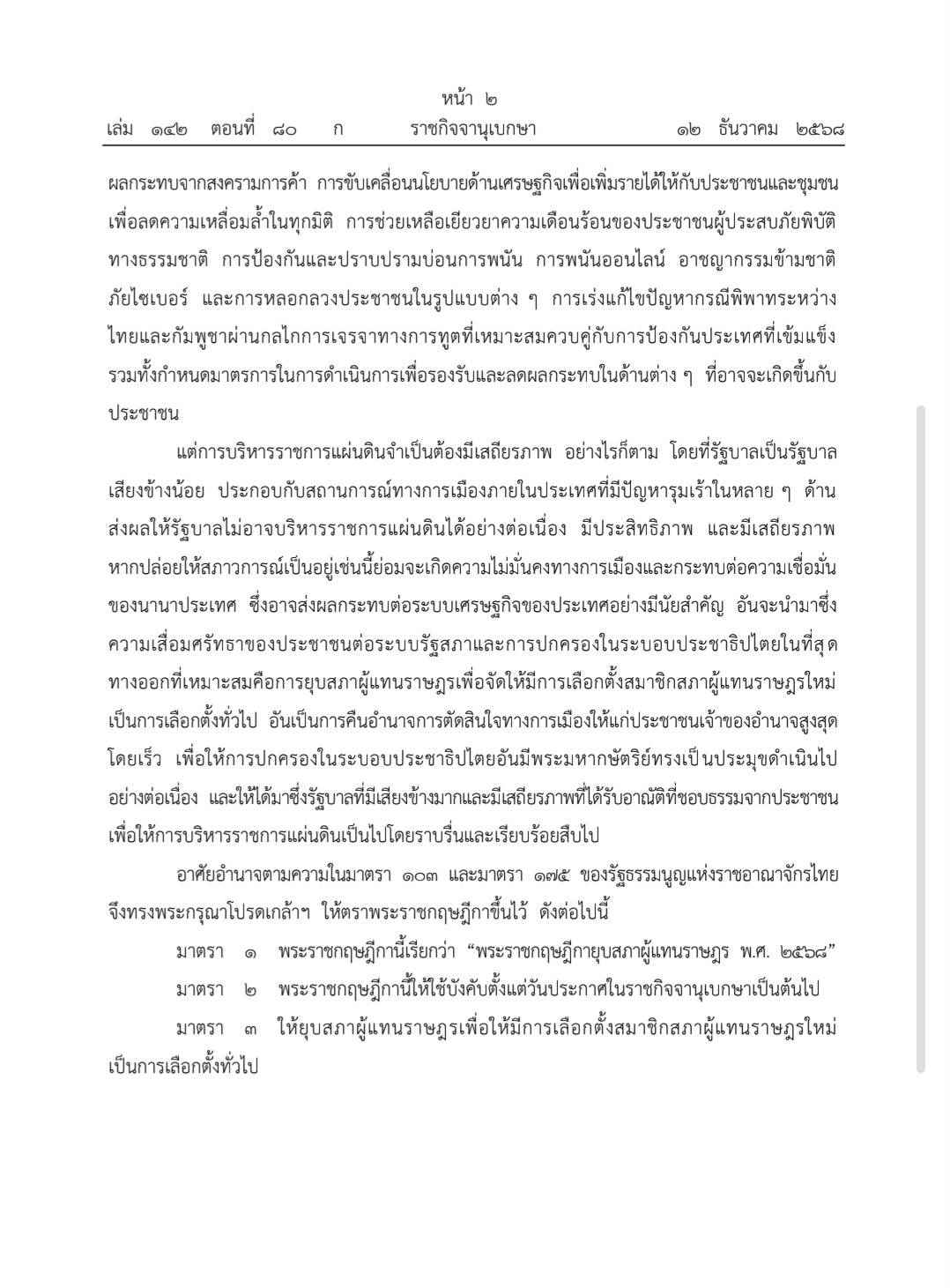เว็บไซต์ ราชกิจจานุเบกษา เผยแพร่พระราชกฤษฎีกายุบสภาผู้แทนราษฎร พ.ศ. 2568 ความว่า พระบาทสมเด็จพระปรเมนทรรามาธิบดีศรีสินทรมหาวชิราลงกรณ พระวชิรเกล้าเจ้าอยู่หัว มีพระบรมราชโองการโปรดเกล้าฯ ให้ประกาศว่า ด้วยนายกรัฐมนตรีได้นำความกราบบังคมทูลฯ ว่า ตามที่รัฐบาลได้เข้ารับหน้าที่ในการบริหารราชการแผ่นดิน ตั้งแต่เดือนกันยายน พ.ศ. 2568 โดยเป็นรัฐบาลเสียงข้างน้อย ซึ่งประกอบด้วยพรรคการเมืองหลายพรรคเข้ามาร่วมจัดตั้งรัฐบาล แต่มิได้มีเสียงข้างมากในสภาผู้แทนราษฎร ในระหว่างที่ประเทศได้เผชิญความท้าทายหลายประการเพราะความไม่แน่นอนรอบด้านทั้งทางเศรษฐกิจ สังคม การเมือง ความสัมพันธ์ระหว่างประเทศ และภูมิรัฐศาสตร์ของโลก รวมทั้งสถานการณ์ความไม่สงบบริเวณชายแดนไทย-กัมพูชา