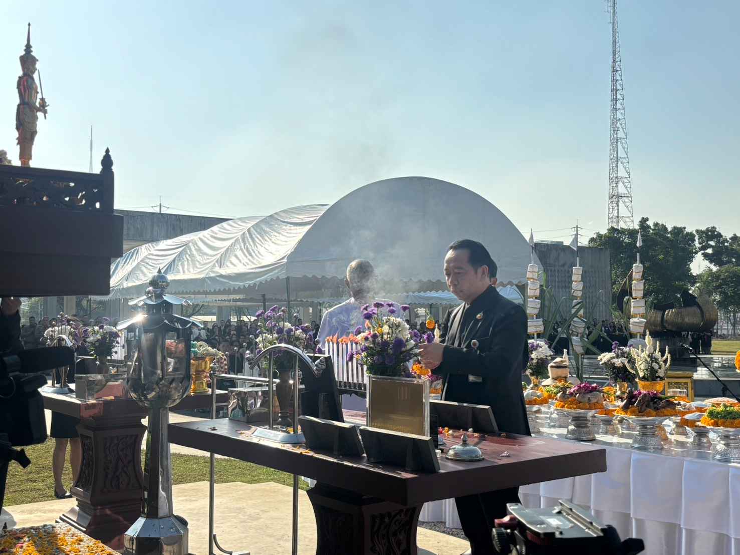 จากนั้น นายฉัตรชัย ปิ่นเงิน หัวหน้าโหรพราหมณ์ สำนักพระราชวัง เป็นผู้ประกอบพิธีบวงสรวง (อ่านโองการบวงสรวง) อัญเชิญองค์พระสยามเทวาธิราช พระเสื้อเมือง พระทรงเมือง และพระภูมิชัยมงคล