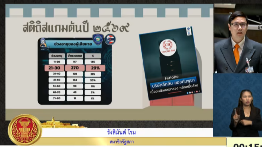 จากนั้น นายรังสิมันต์ โรม สส.แบบบัญชีรายชื่อ พรรคประชาชน อภิปรายเกี่ยวกับนโยบายการปราบปรามสแกมเมอร์ กลุ่มทุนสีเทา รวมถึงประเด็นการทุจริตคอร์รัปชัน โดยตั้งข้อสังเกตถึงความไม่สอดคล้องในการดำเนินงานของรัฐบาลปัจจุบัน ภายใต้การนำของนายอนุทิน ชาญวีรกูล นายกรัฐมนตรีและรัฐมนตรีว่าการกระทรวงมหาดไทย เมื่อเปรียบเทียบกับการทำงานในรัฐบาลชุดก่อน ซึ่งมีบุคคลบางรายดำรงตำแหน่งรัฐมนตรีต่อเนื่อง